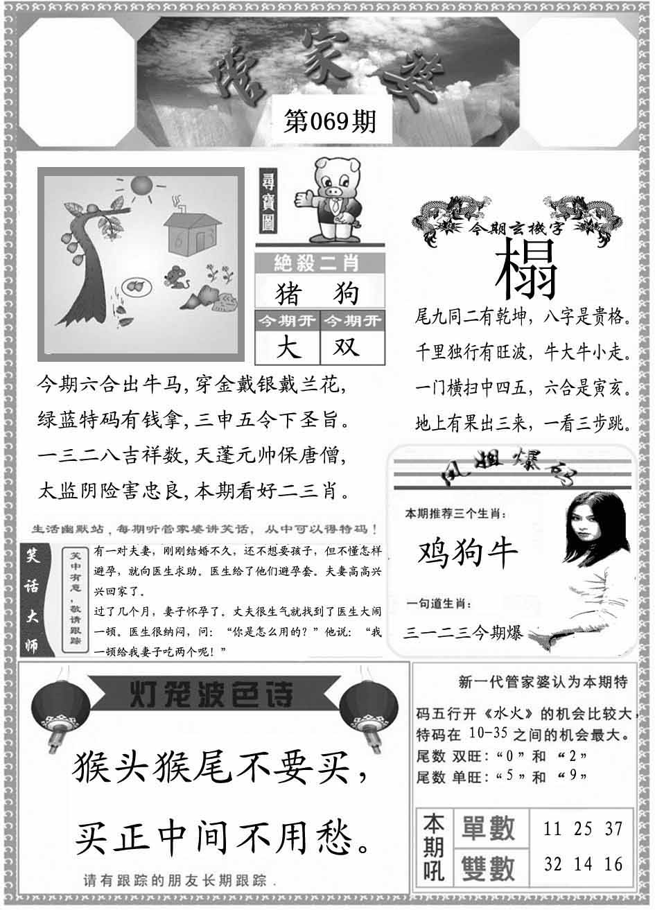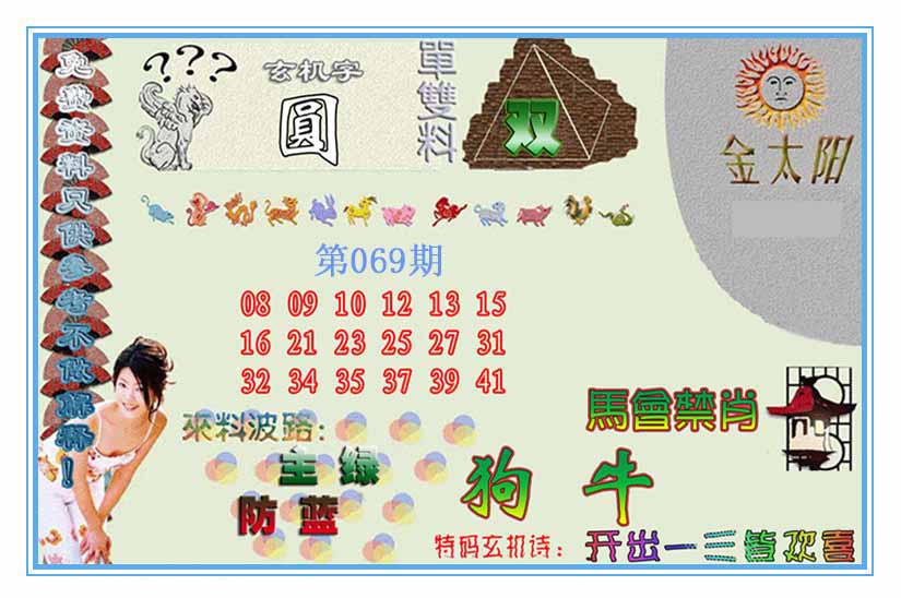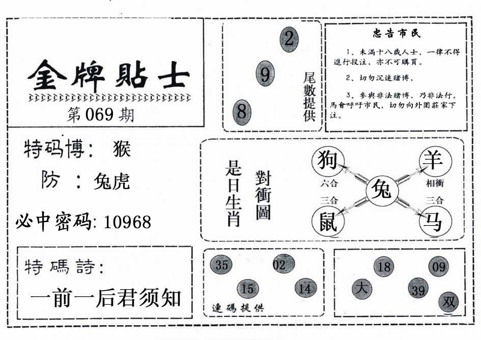069期:【另版跑狗】开0 跑狗九肖:兔猴鸡狗牛龙虎羊鼠 跑狗七肖:兔猴鸡狗牛龙虎 跑狗五肖:兔猴鸡狗牛 跑狗三肖:兔猴鸡 12码:20 26 35 15 33 08 37 34 43 11 39 41 | ||