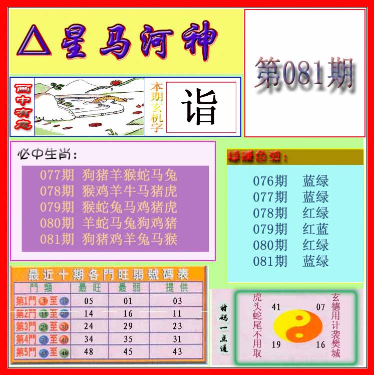 079期:【另版跑狗】开马13 跑狗九肖:牛鼠猴龙马羊虎蛇鸡 跑狗七肖:牛鼠猴龙马羊虎 跑狗五肖:牛鼠猴龙马 跑狗三肖:牛鼠猴 12码:05 35 27 15 03 44 18 25 41 13 08 42 | ||