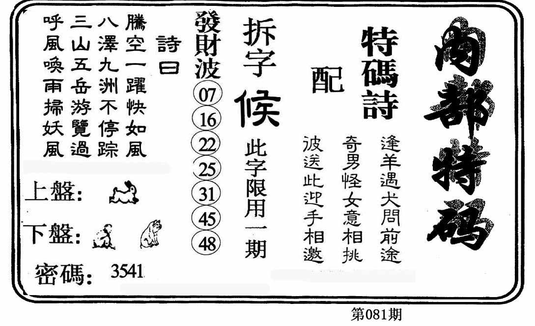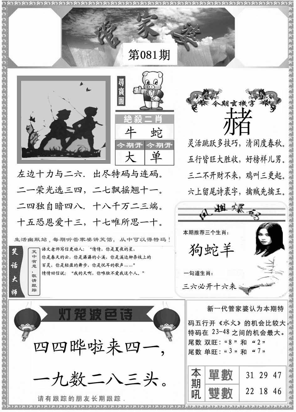 081期推荐六肖:<羊兔马猴龙狗>内幕资料请大胆下注! | ||