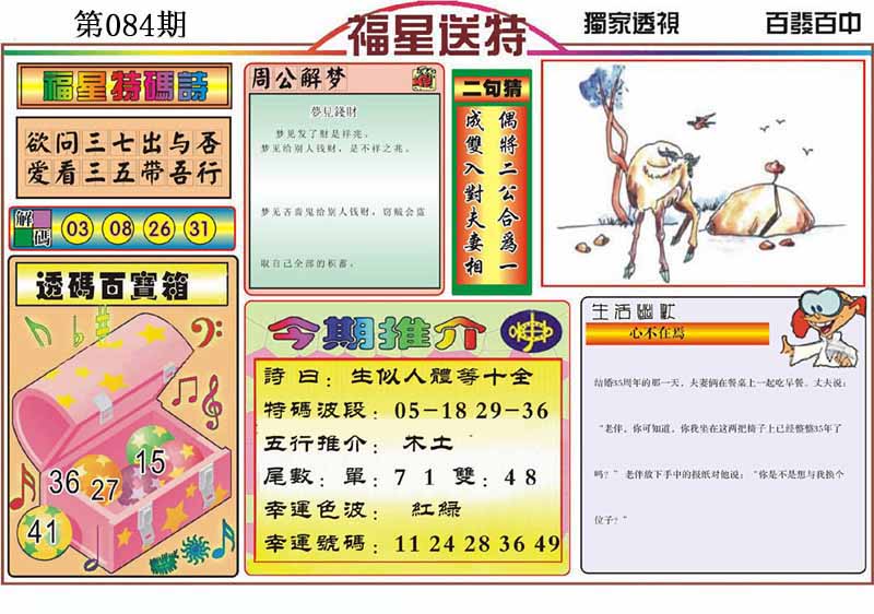 | 083期:精准五不中【41 46 30 15 08】兔28 |