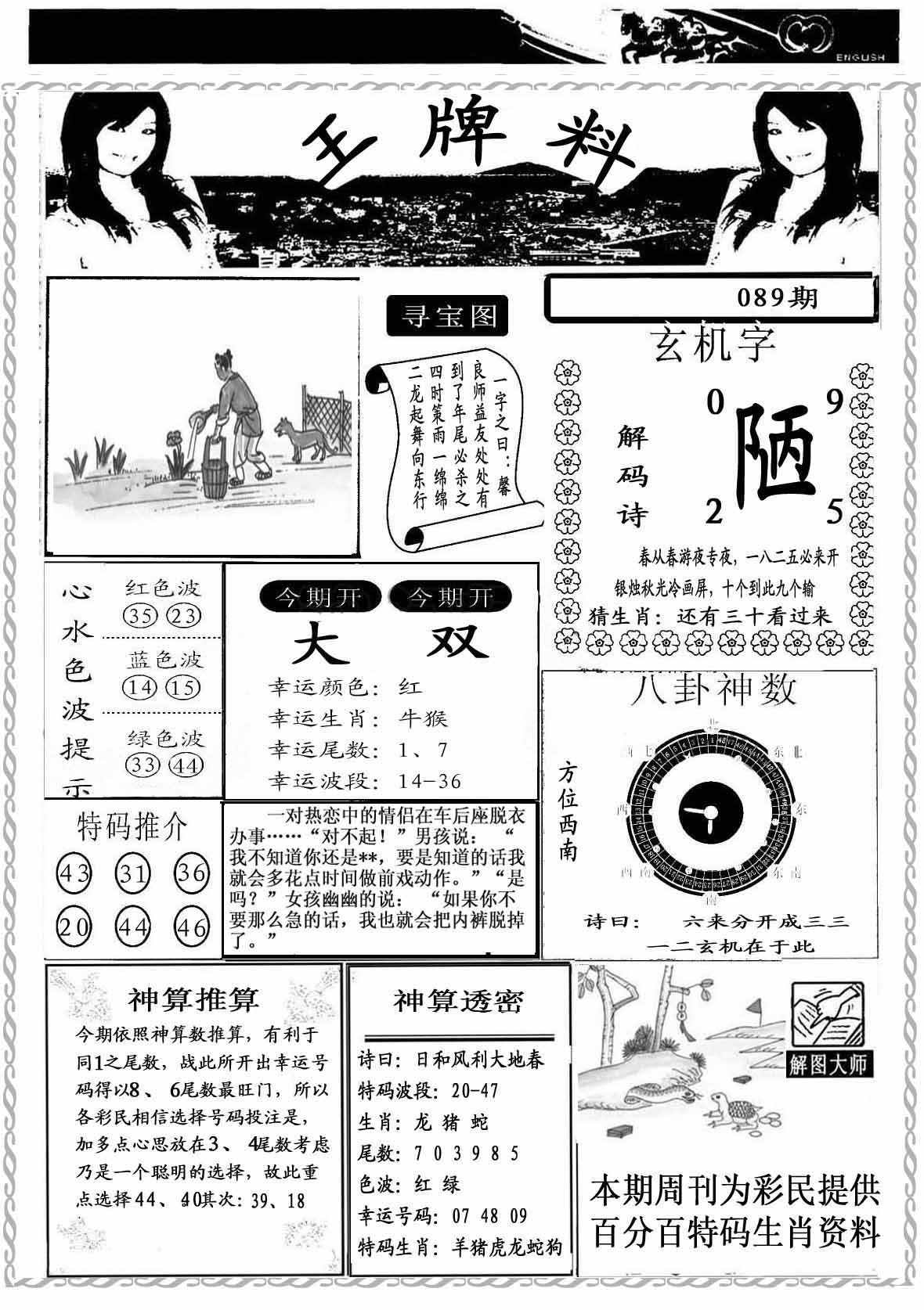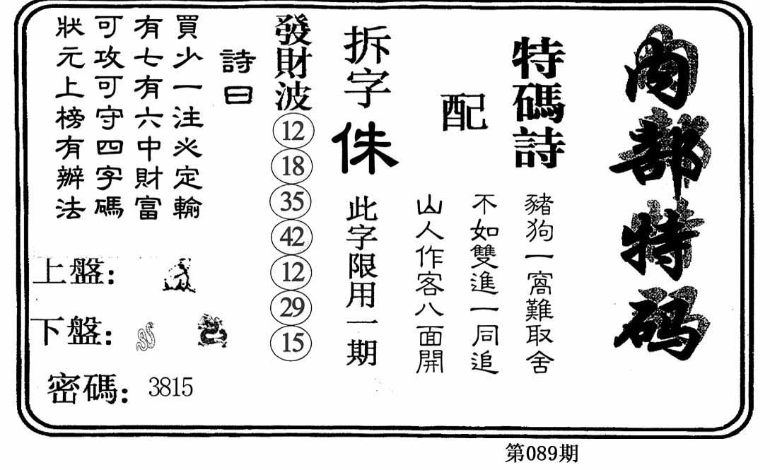 089期:【另版跑狗】开0 跑狗九肖:猪蛇虎羊狗牛马鸡龙 跑狗七肖:猪蛇虎羊狗牛马 跑狗五肖:猪蛇虎羊狗 跑狗三肖:猪蛇虎 12码:08 35 22 06 19 02 42 41 15 21 05 13 | ||