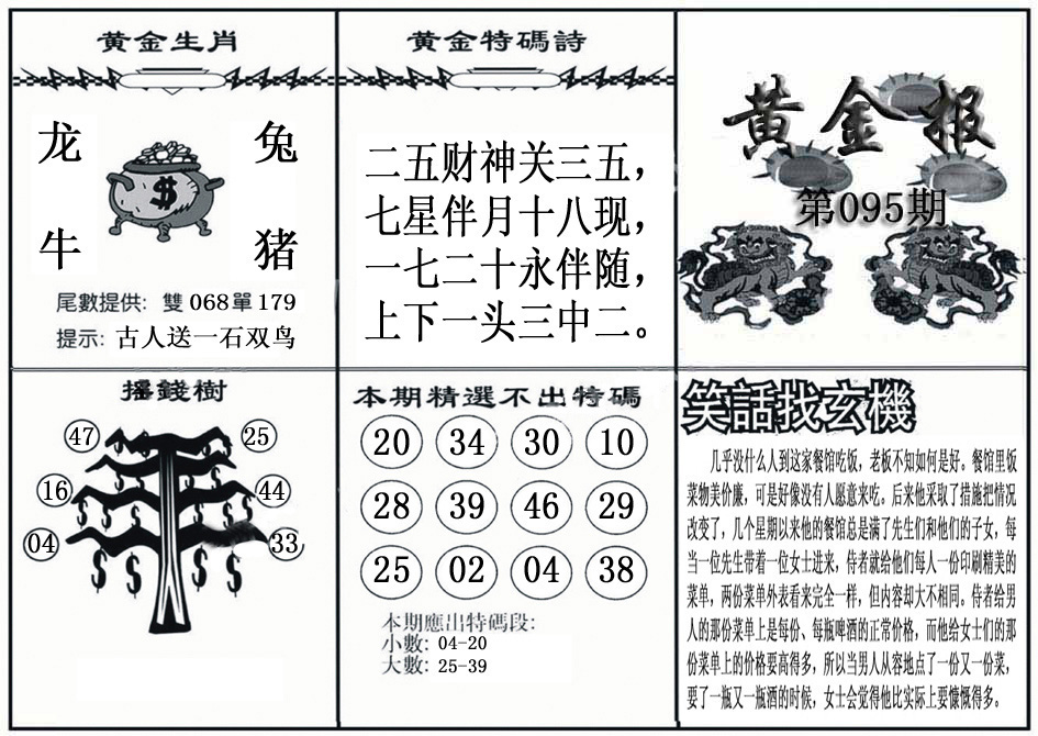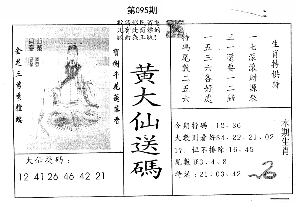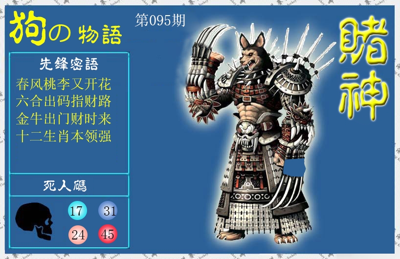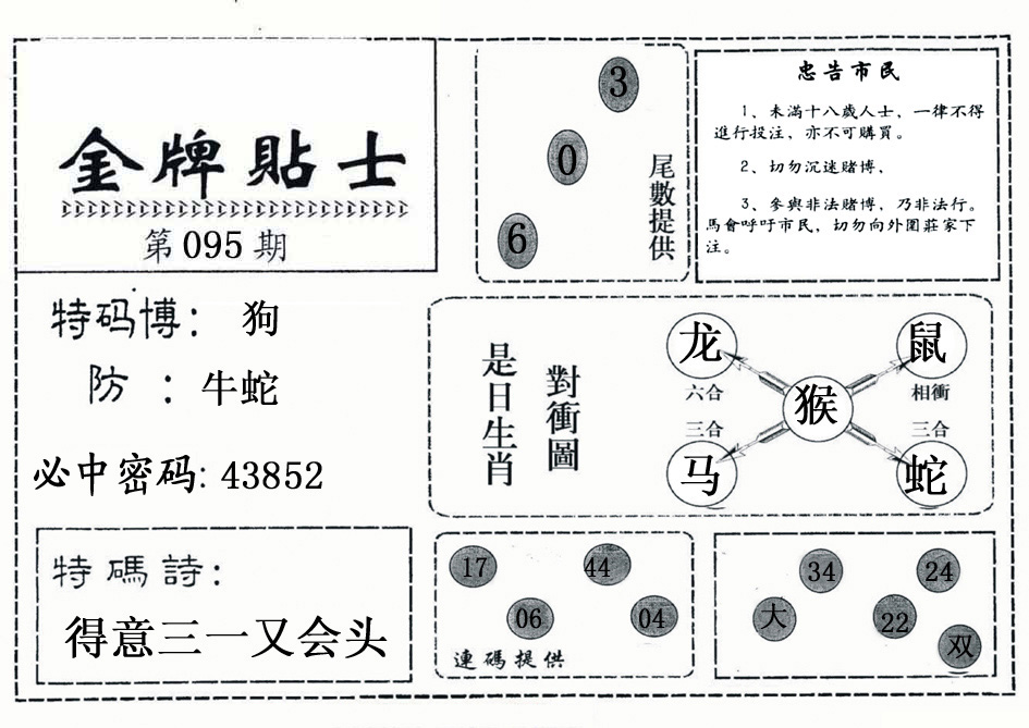 095期:【另版跑狗】开0 跑狗九肖:蛇猴兔猪牛马羊狗龙 跑狗七肖:蛇猴兔猪牛马羊 跑狗五肖:蛇猴兔猪牛 跑狗三肖:蛇猴兔 12码:31 47 14 38 21 18 36 39 33 13 04 08 | ||