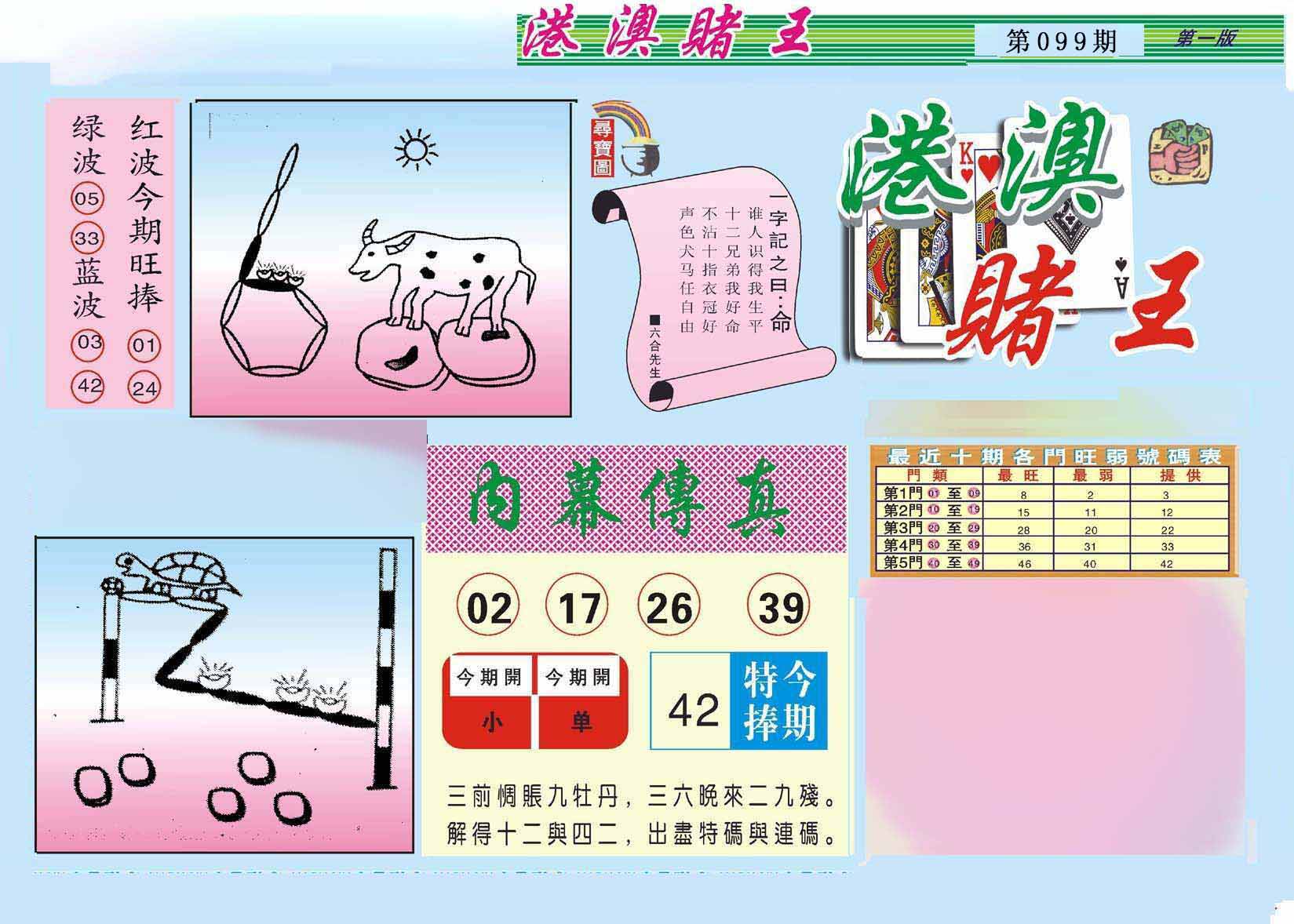 099期:【另版跑狗】开0 跑狗九肖:马鼠猴牛虎鸡龙羊狗 跑狗七肖:马鼠猴牛虎鸡龙 跑狗五肖:马鼠猴牛虎 跑狗三肖:马鼠猴 12码:46 02 34 36 08 17 47 32 37 44 27 22 | ||