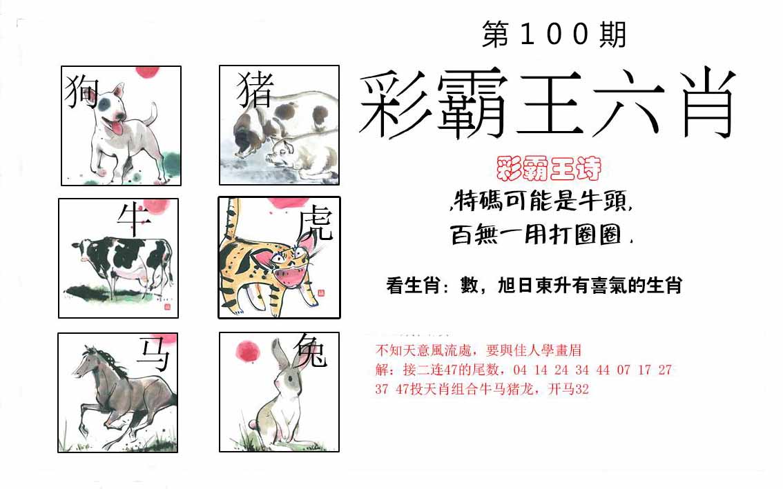 100期推荐六肖:<牛鸡羊猴马猪>内幕资料请大胆下注! | ||