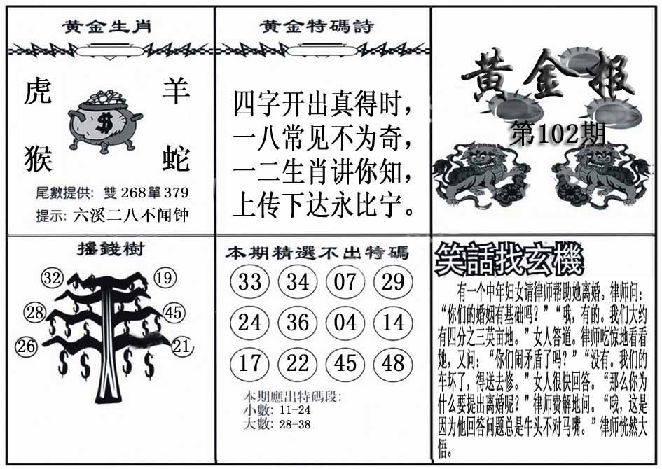 102期原创20码中特开:?00 04,48,15,28,38,22,32,07,25,11 46,13,43,44,23,14,33,29,01,05 |