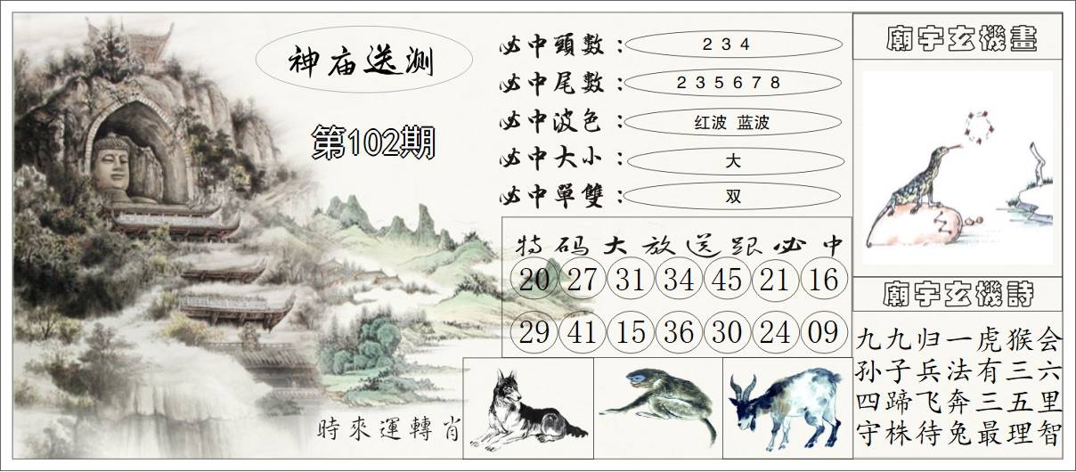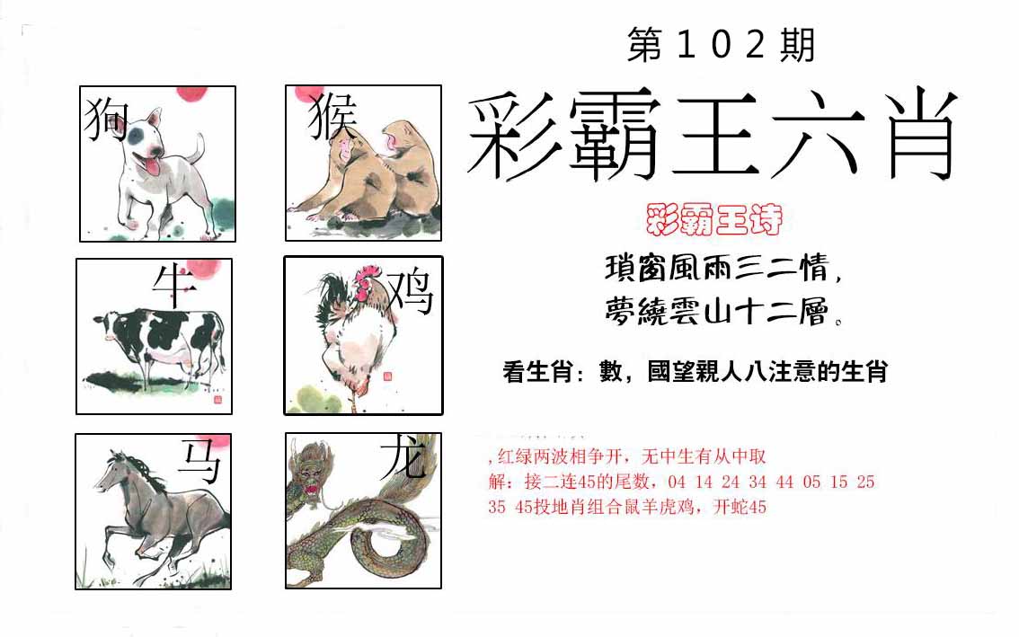 102期:【另版跑狗】开0 跑狗九肖:鸡马鼠牛虎龙蛇猪猴 跑狗七肖:鸡马鼠牛虎龙蛇 跑狗五肖:鸡马鼠牛虎 跑狗三肖:鸡马鼠 12码:16 09 43 17 47 13 46 34 36 26 05 23 | ||
