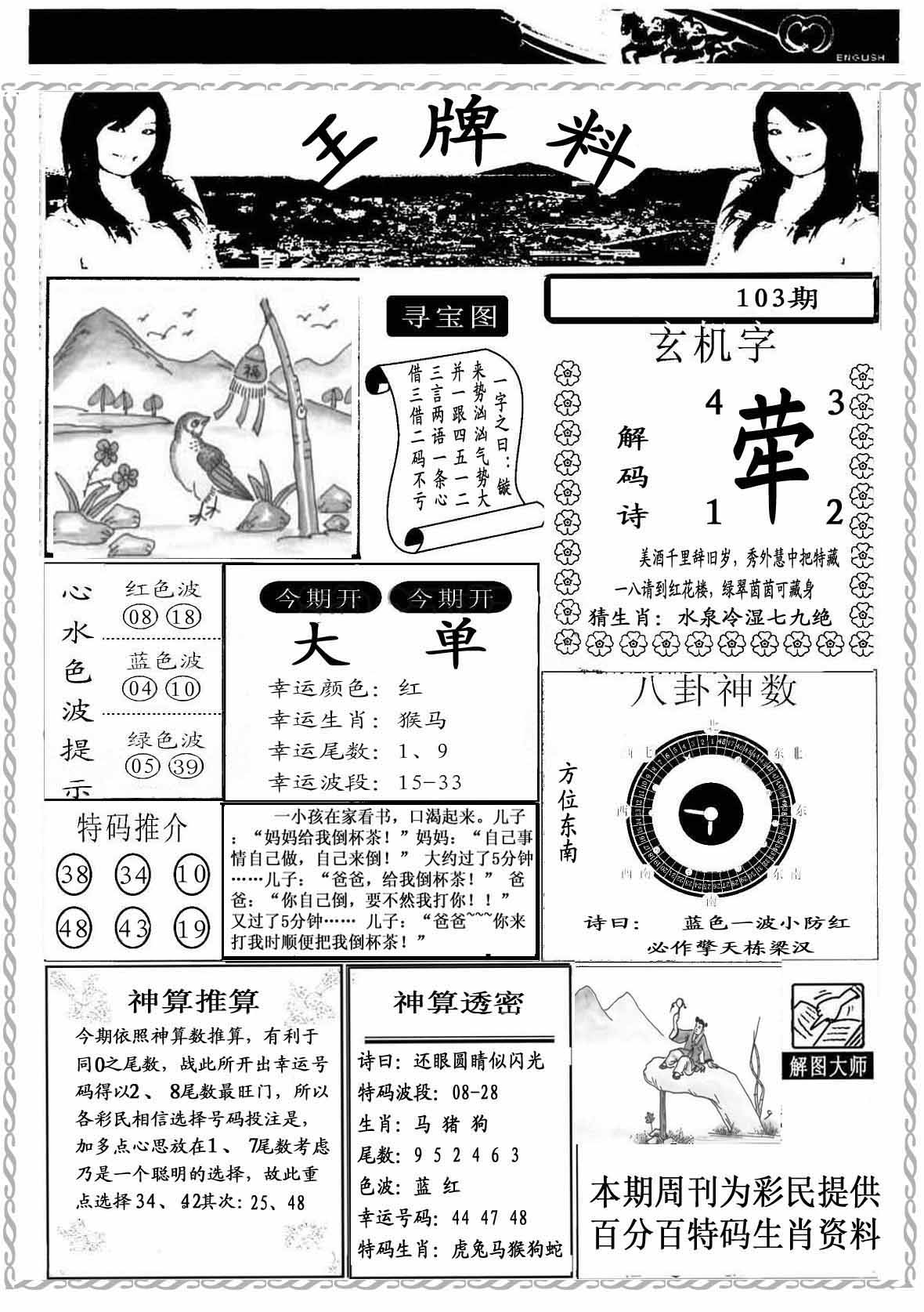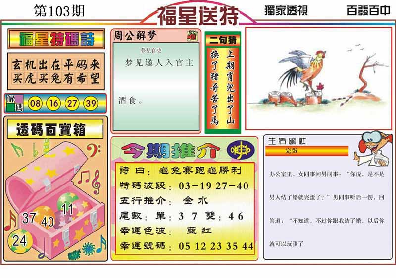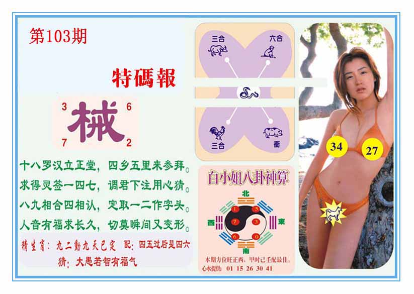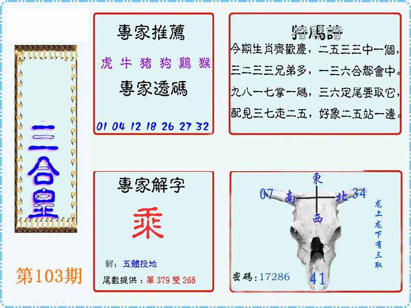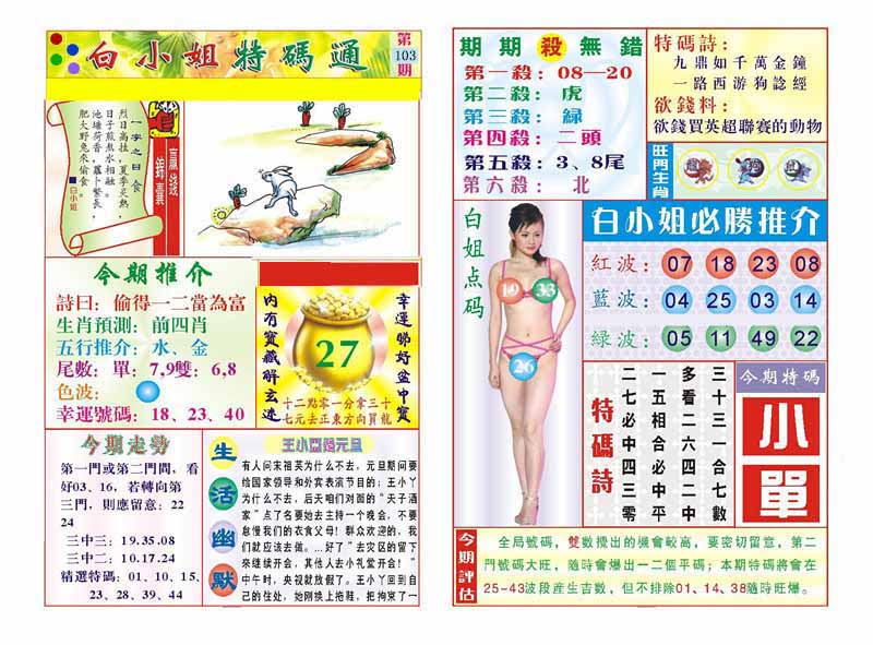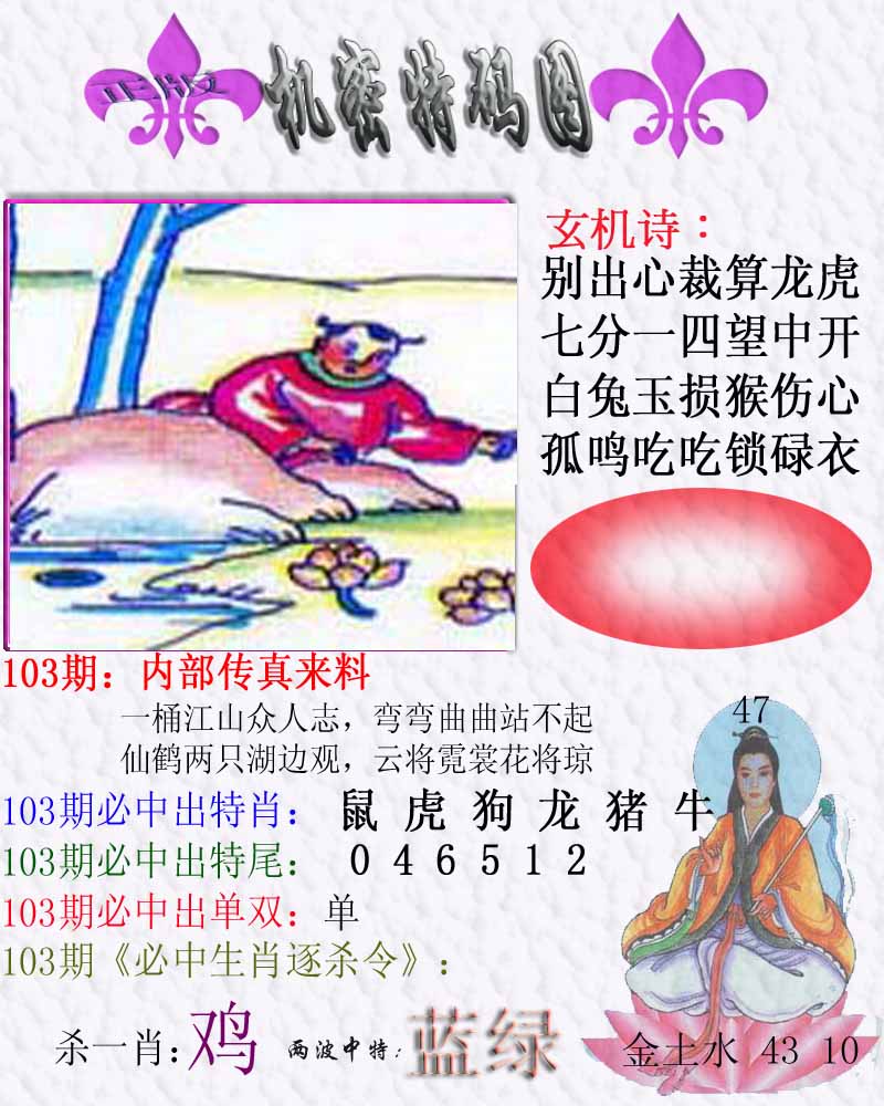 | 103期:《主攻:内幕规律平特肖:<兔>下50万》! | ||