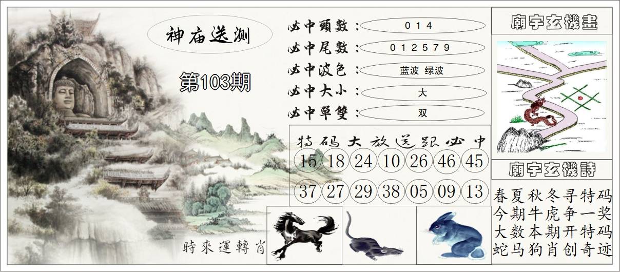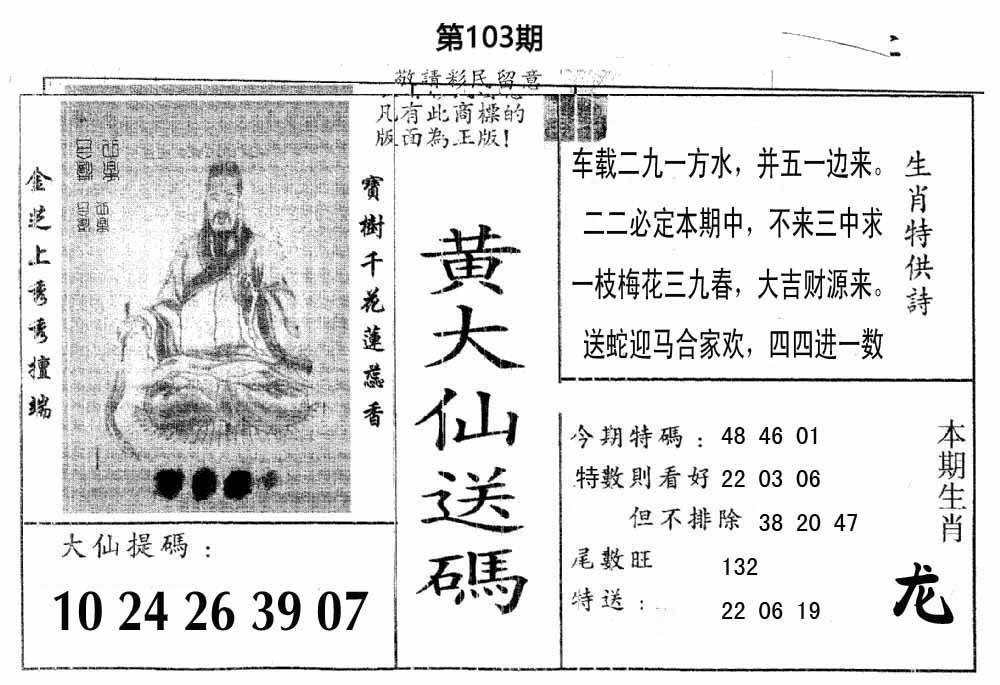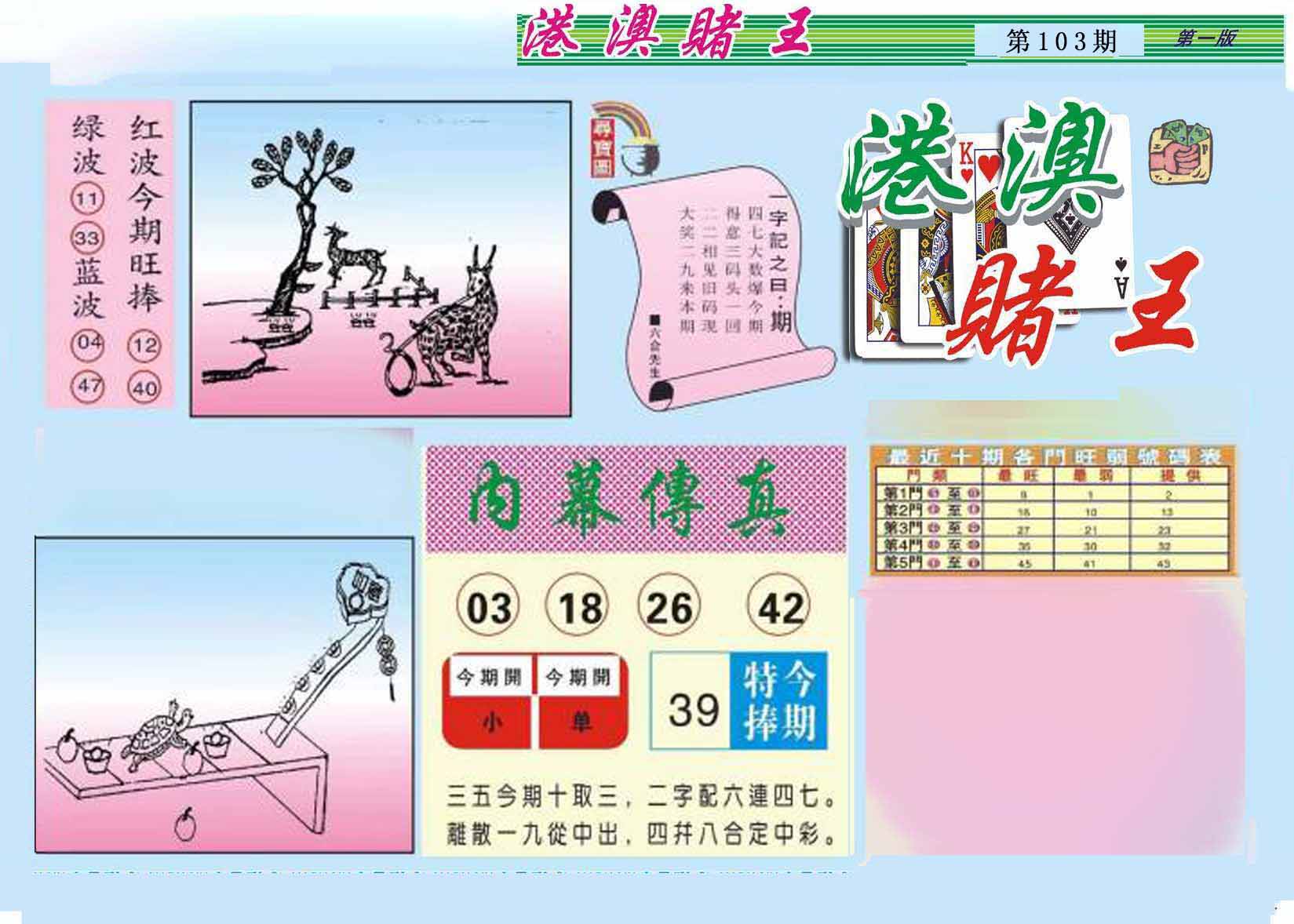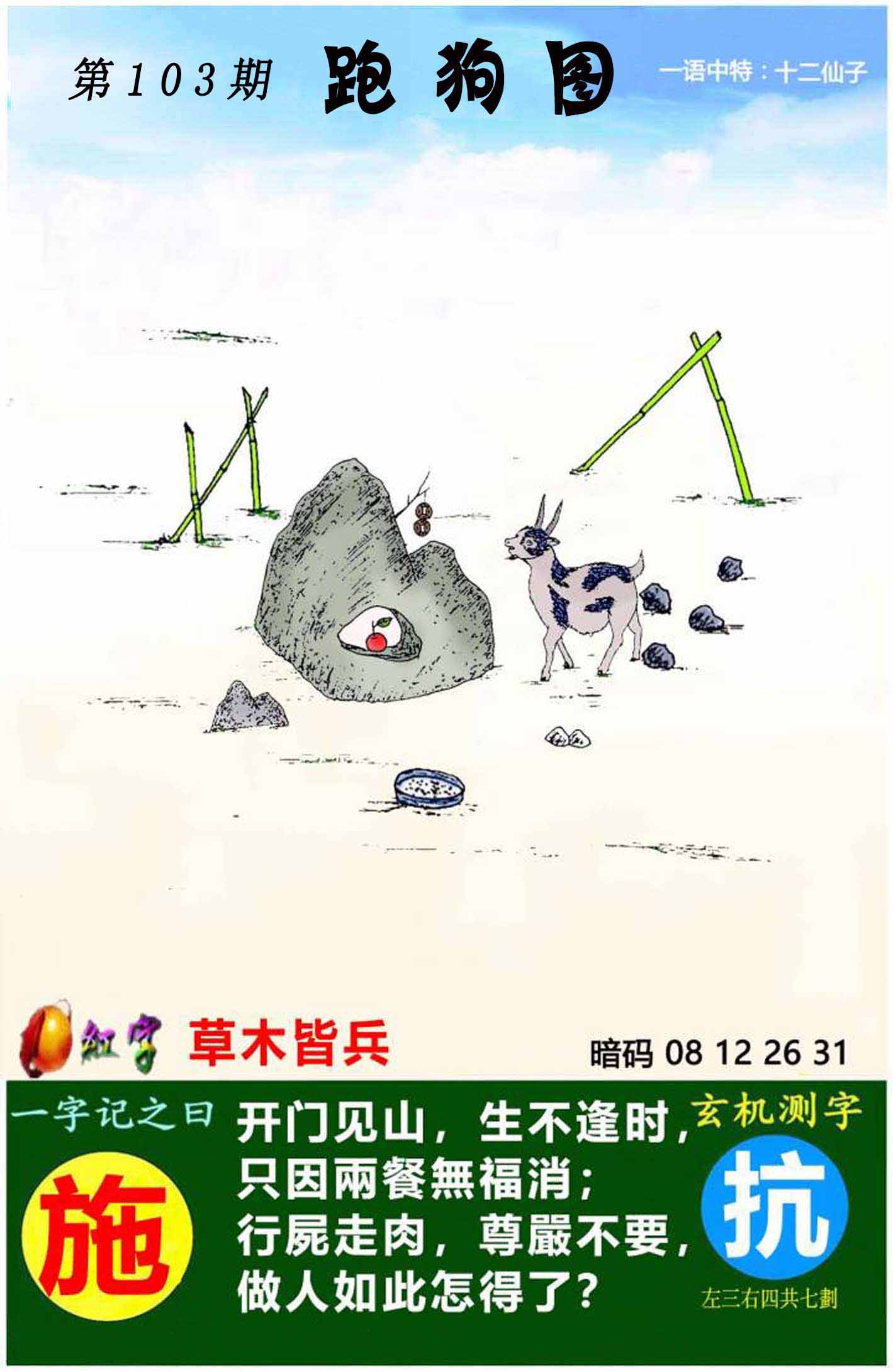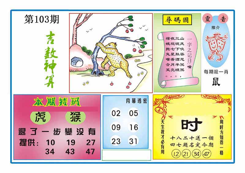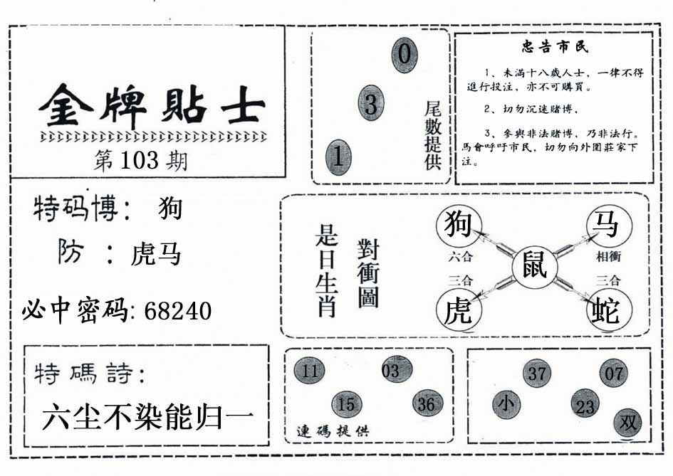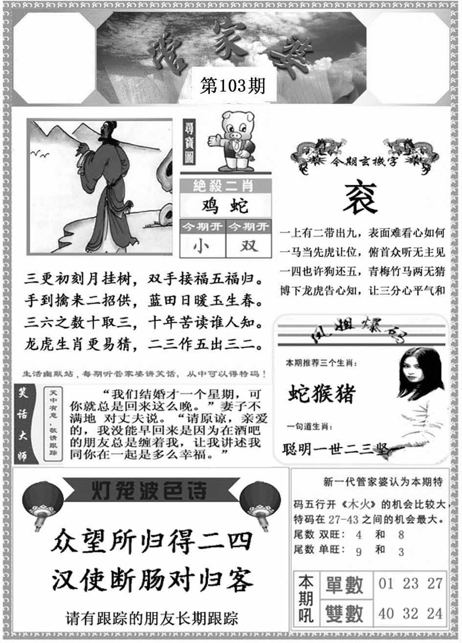 103期:【另版跑狗】开0 跑狗九肖:猪虎兔马鼠牛龙蛇猴 跑狗七肖:猪虎兔马鼠牛龙 跑狗五肖:猪虎兔马鼠 跑狗三肖:猪虎兔 12码:26 06 15 33 25 11 12 31 45 38 19 22 | ||