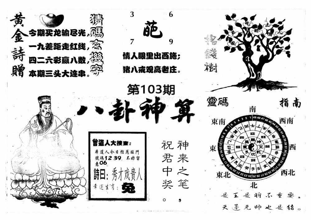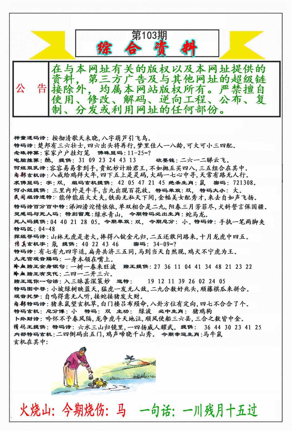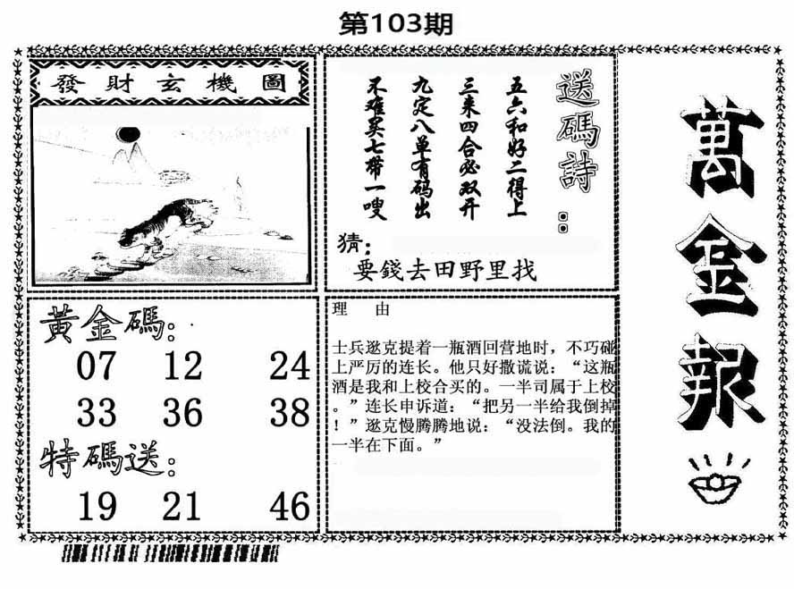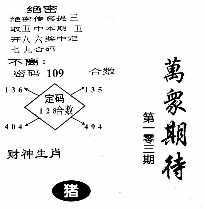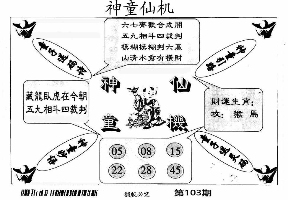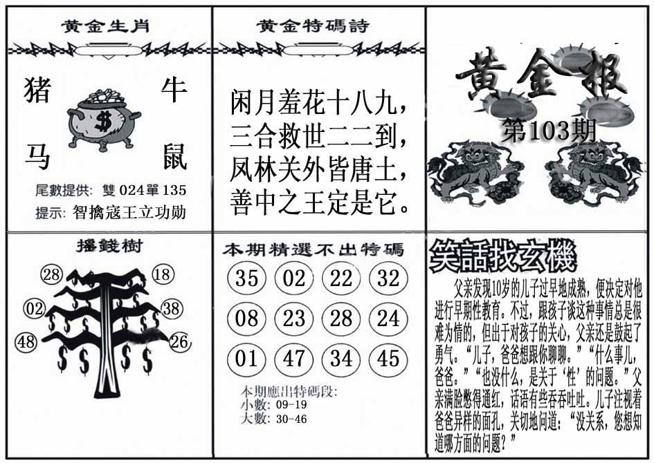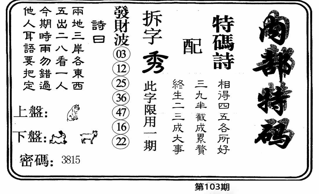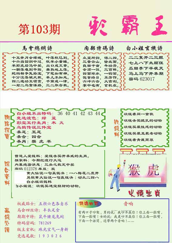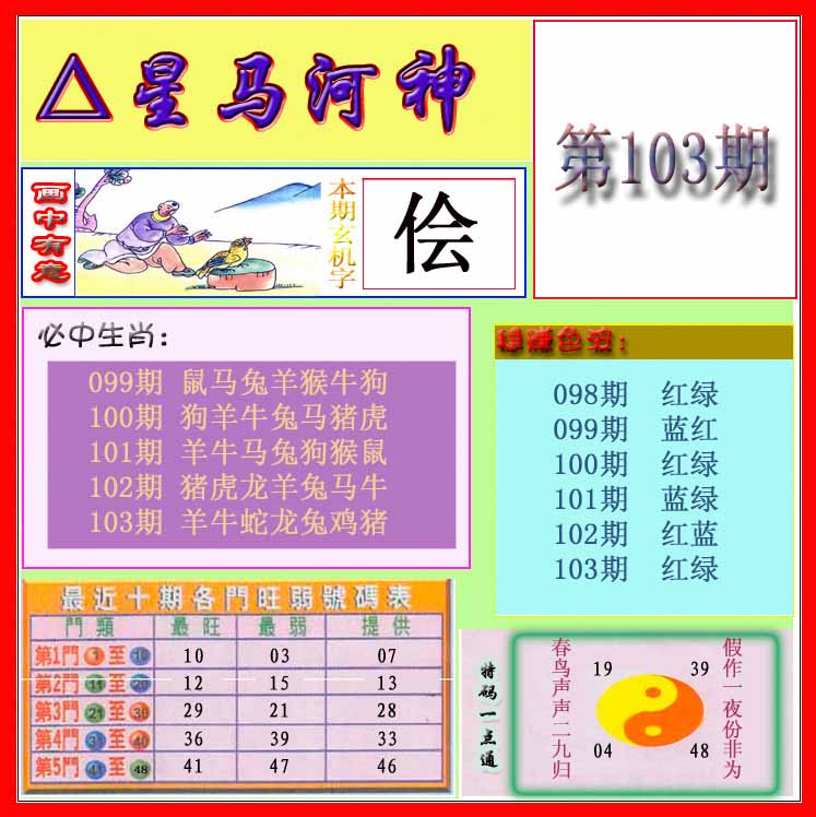 103期:【另版跑狗】开0 跑狗九肖:猪虎兔马鼠牛龙蛇猴 跑狗七肖:猪虎兔马鼠牛龙 跑狗五肖:猪虎兔马鼠 跑狗三肖:猪虎兔 12码:26 06 15 33 25 11 12 31 45 38 19 22 | ||