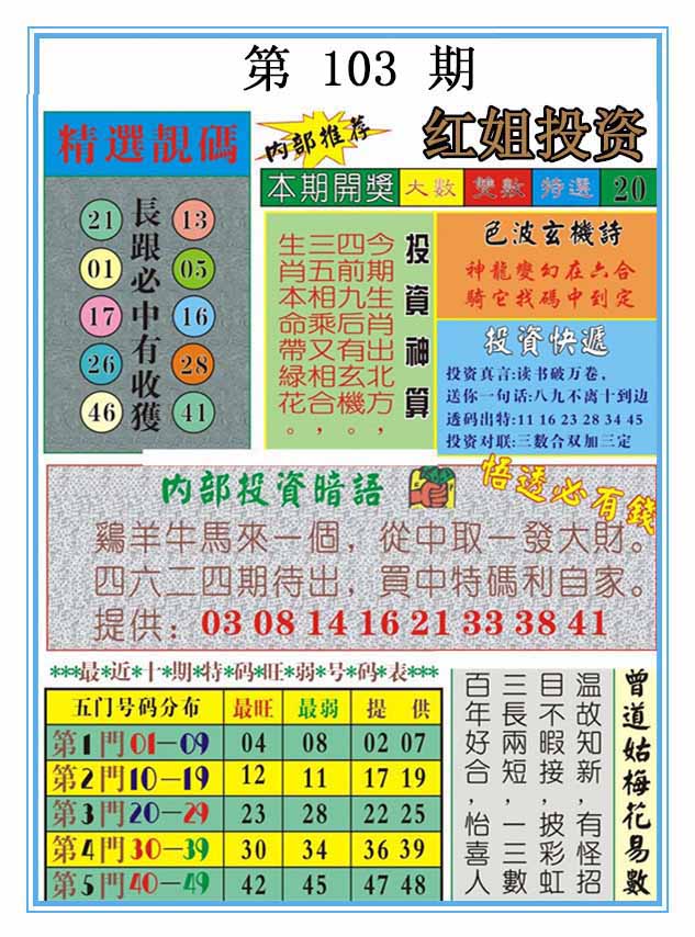103期原创20码中特开:?00 42,22,18,36,31,38,41,03,33,14 05,19,12,13,16,23,06,28,39,02 |