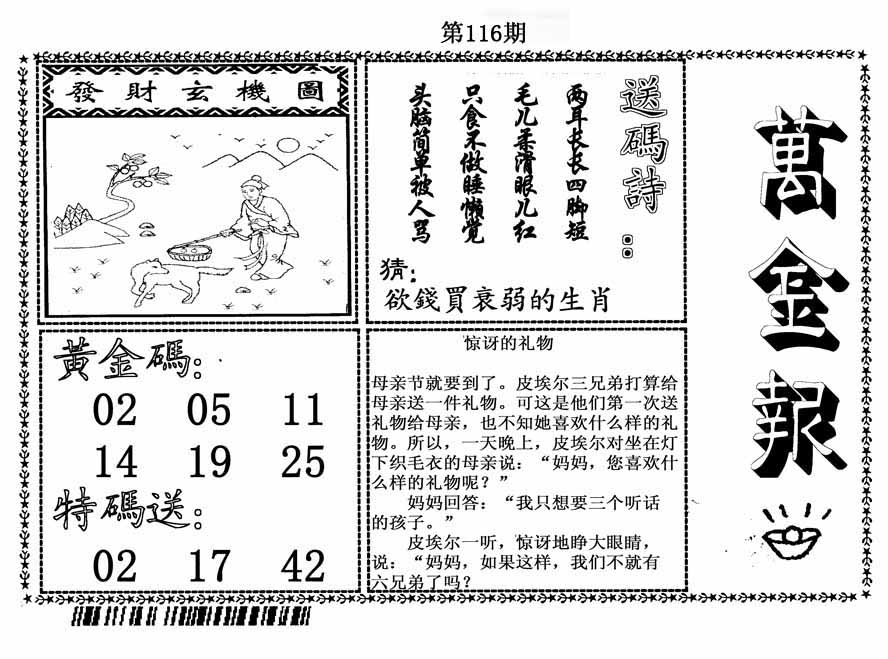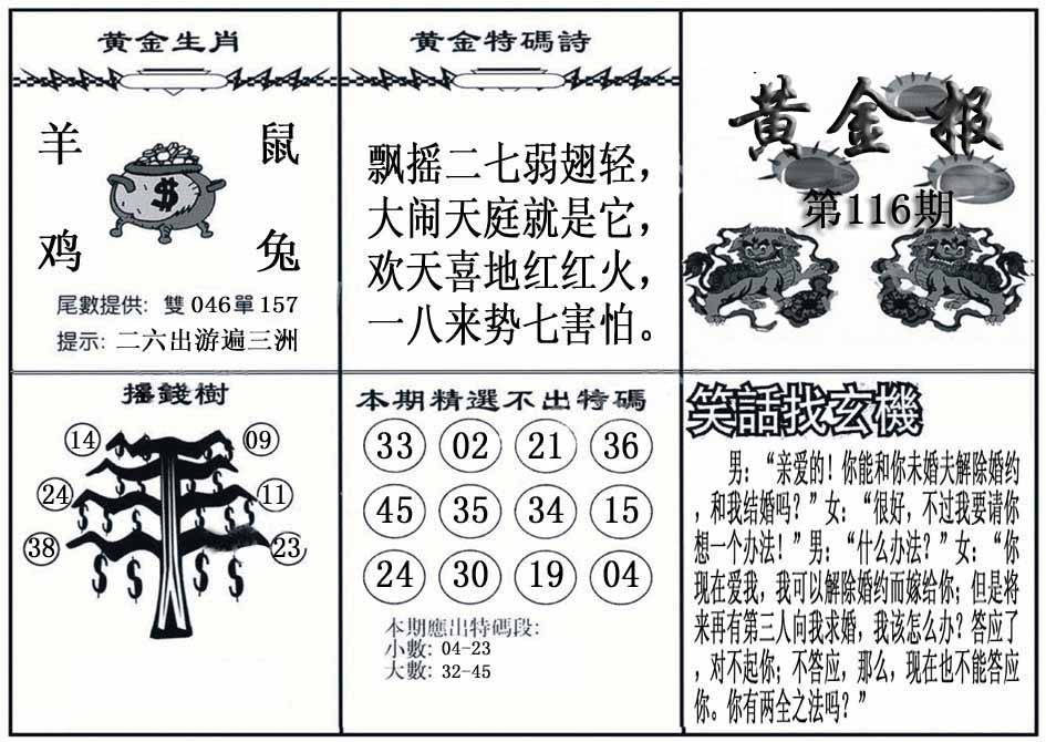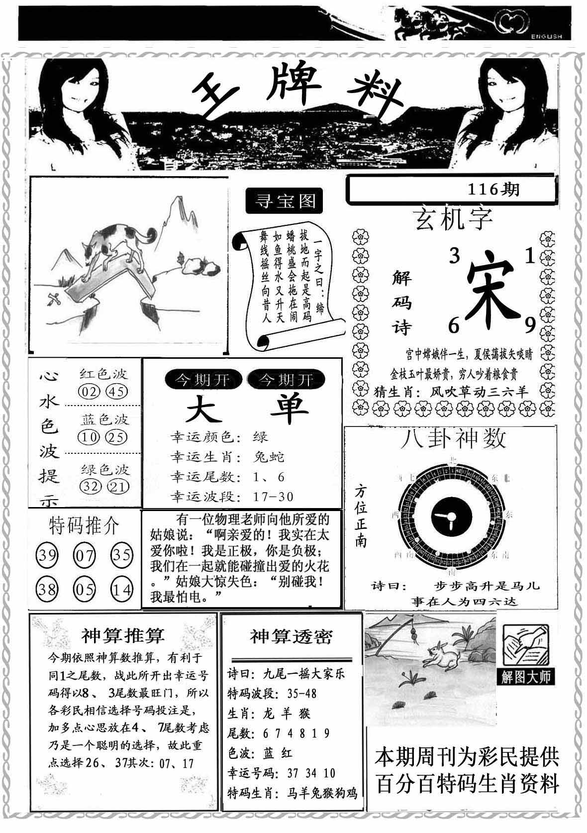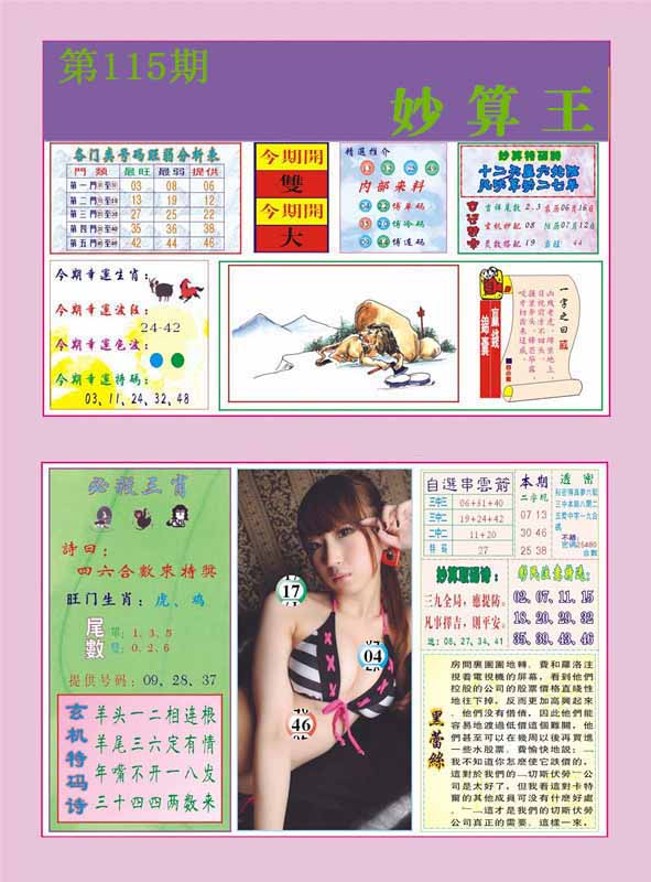 112期:【另版跑狗】开虎29 跑狗九肖:羊狗虎鼠牛马兔龙鸡 跑狗七肖:羊狗虎鼠牛马兔 跑狗五肖:羊狗虎鼠牛 跑狗三肖:羊狗虎 12码:04 25 42 26 05 46 15 21 41 13 24 23 | ||