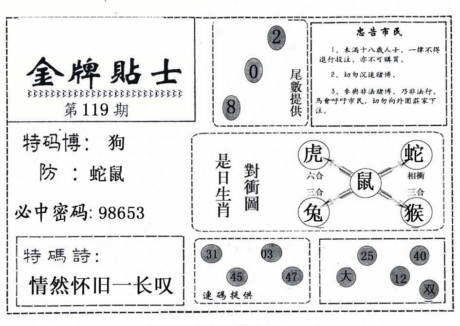 | ⑦肖:鼠兔狗猪猴鸡虎~平均押 | ||