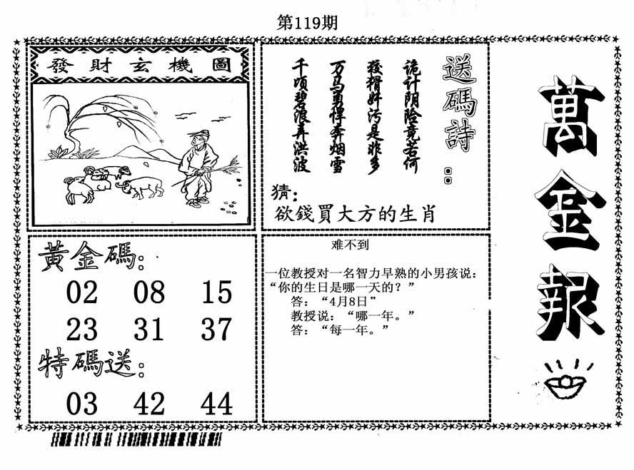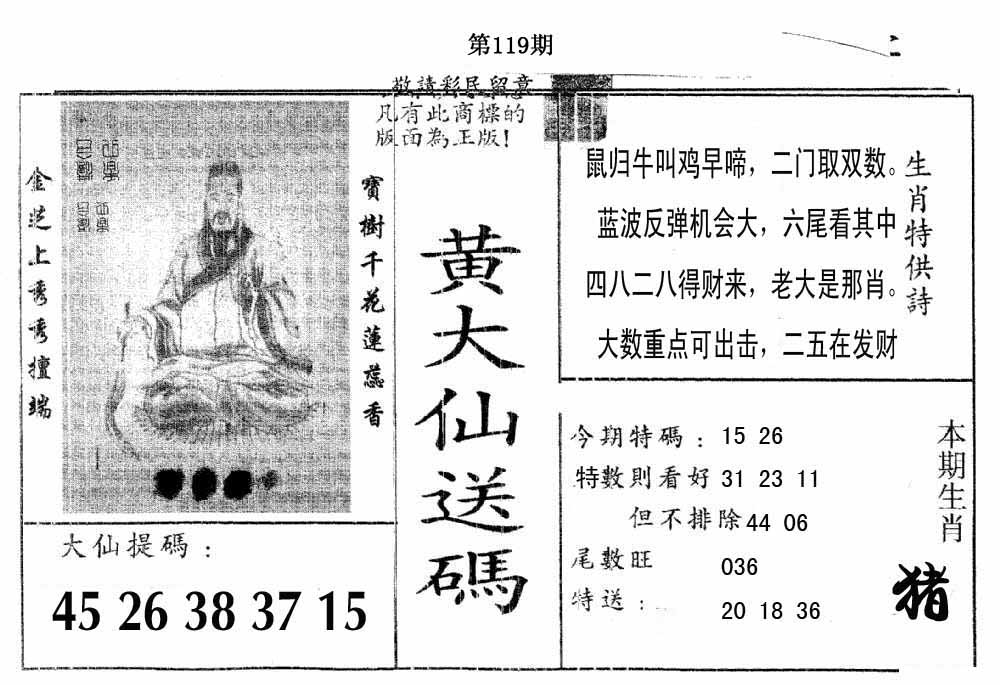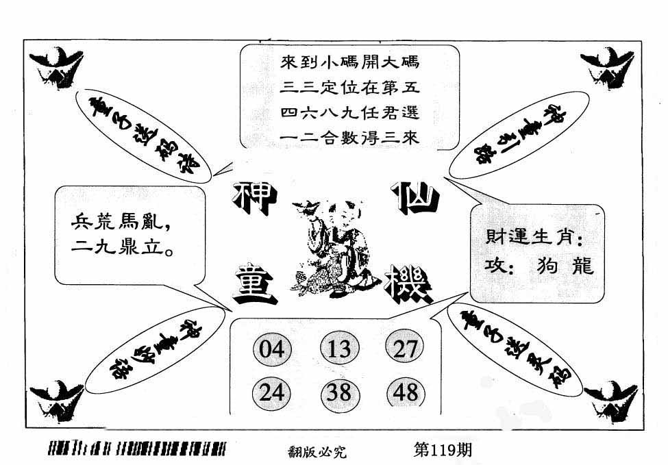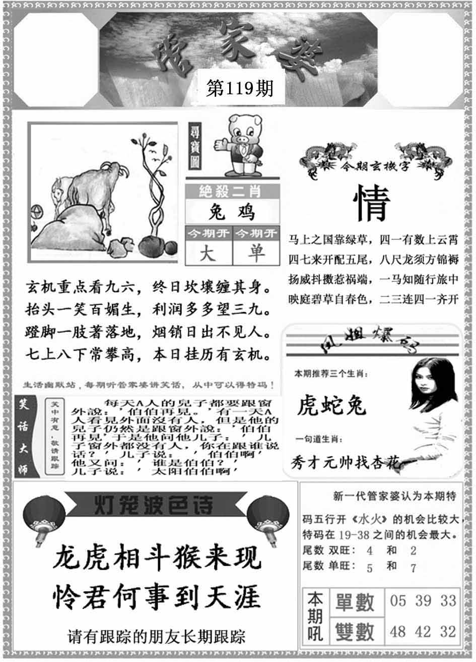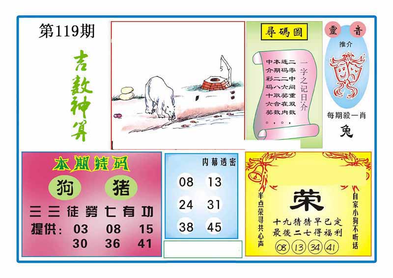 117期:【另版跑狗】开牛30 跑狗九肖:羊蛇猪牛马狗鼠兔虎 跑狗七肖:羊蛇猪牛马狗鼠 跑狗五肖:羊蛇猪牛马 跑狗三肖:羊蛇猪 12码:13 11 36 48 05 20 10 39 04 15 24 40 | ||