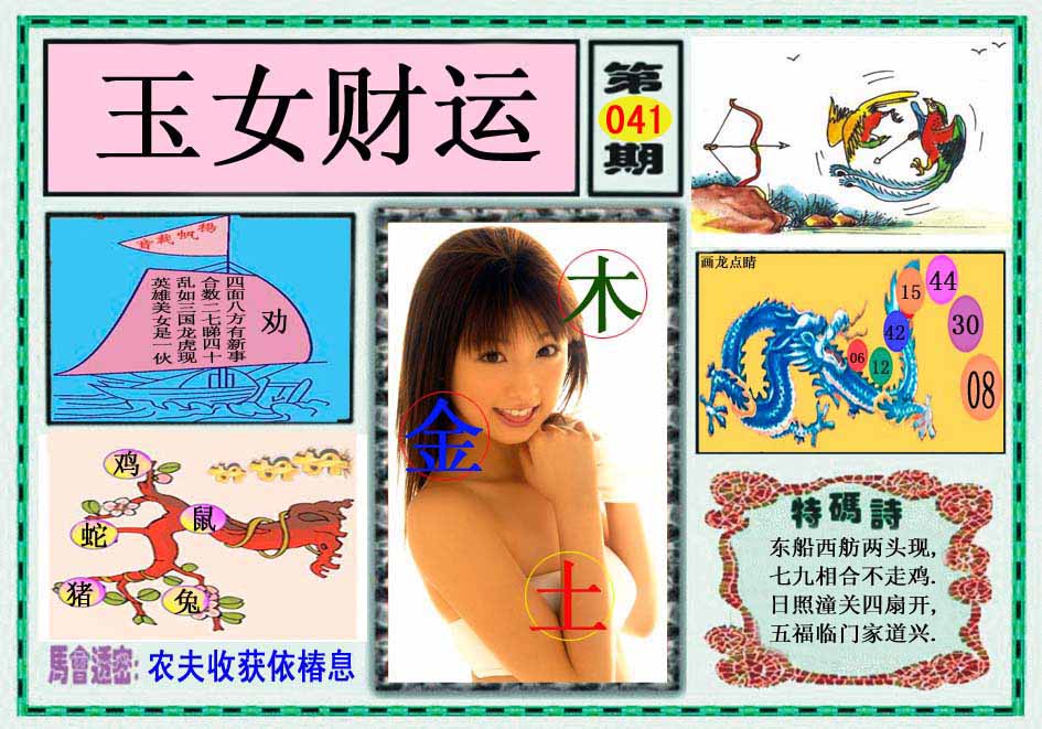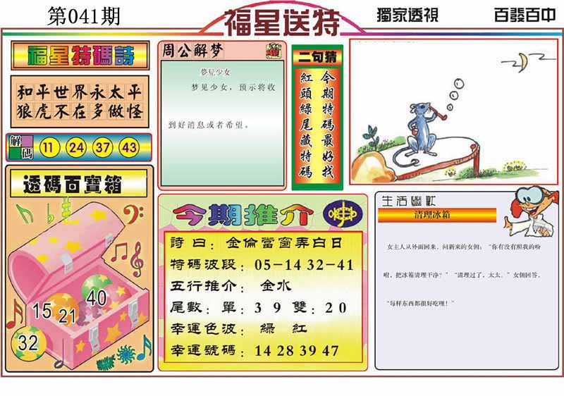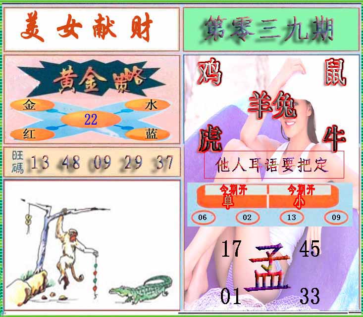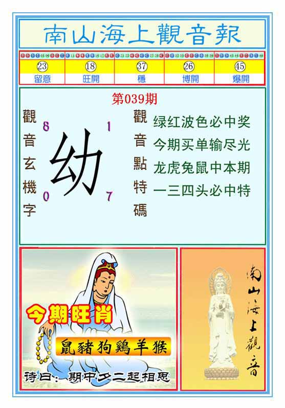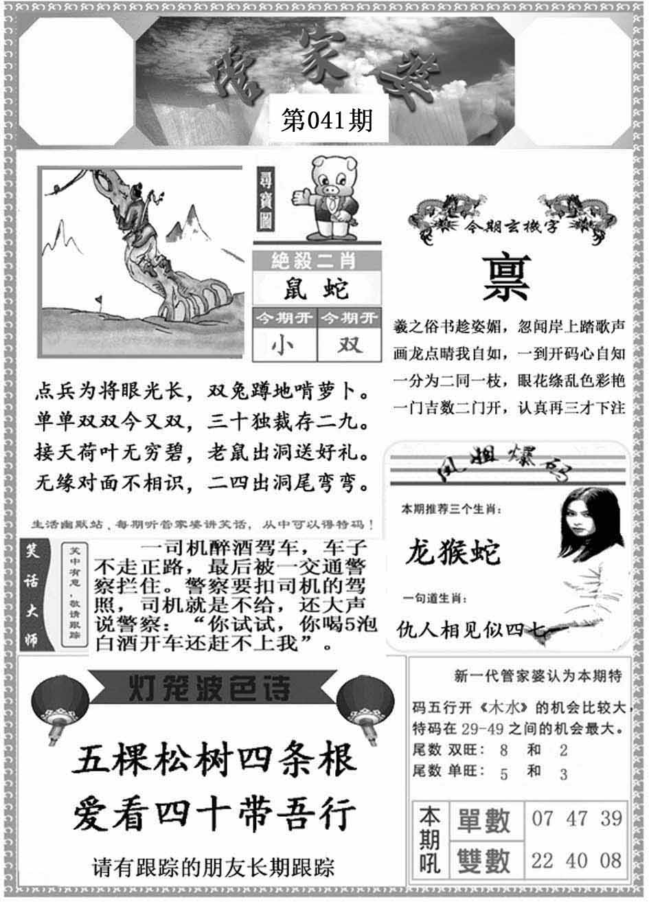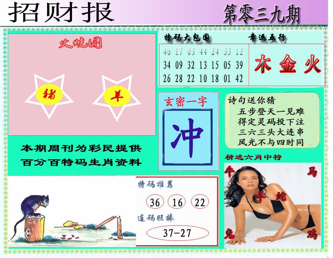| 026期:精准五不中【39 22 25 30 41】鼠30 |