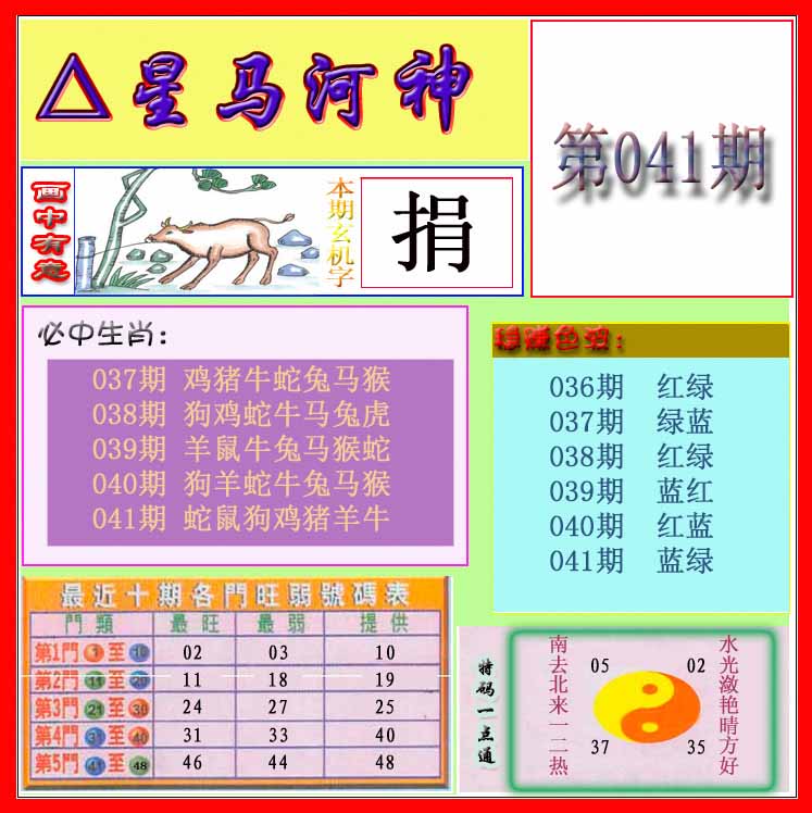 038期:【另版跑狗】开猪31 跑狗九肖:马鼠猪虎鸡羊兔猴龙 跑狗七肖:马鼠猪虎鸡羊兔 跑狗五肖:马鼠猪虎鸡 跑狗三肖:马鼠猪 12码:10 44 22 11 14 02 28 21 29 06 36 34 | ||