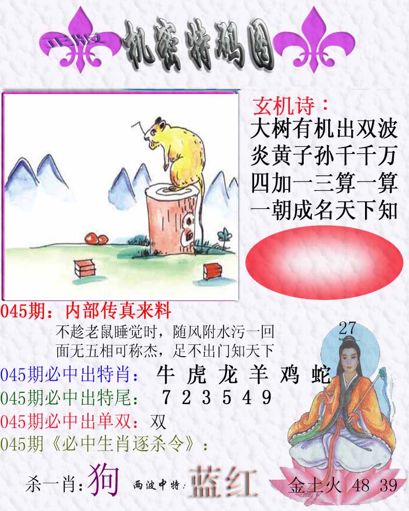 043期:【另版跑狗】开鸡33 跑狗九肖:龙鸡鼠兔马虎蛇猪狗 跑狗七肖:龙鸡鼠兔马虎蛇 跑狗五肖:龙鸡鼠兔马 跑狗三肖:龙鸡鼠 12码:27 32 42 22 19 23 10 46 12 45 41 49 | ||
