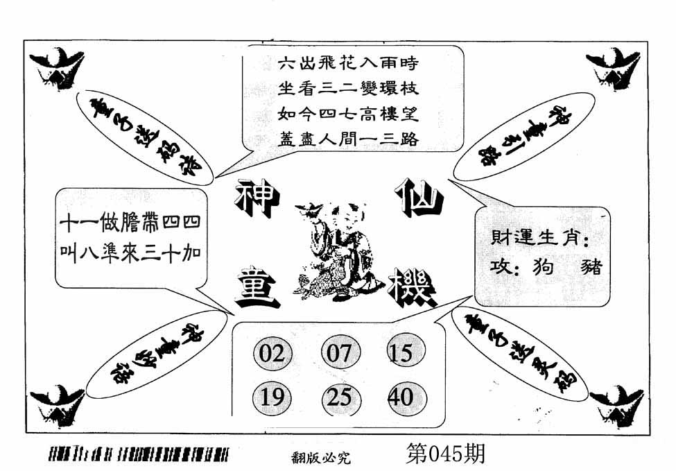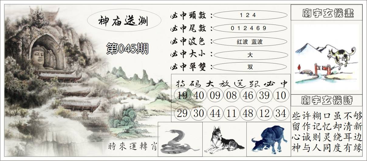 045期:【另版跑狗】开0 跑狗九肖:鼠虎龙兔马鸡狗牛羊 跑狗七肖:鼠虎龙兔马鸡狗 跑狗五肖:鼠虎龙兔马 跑狗三肖:鼠虎龙 12码:37 30 47 13 48 31 02 29 17 09 26 27 | ||