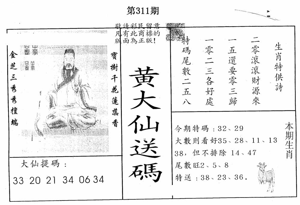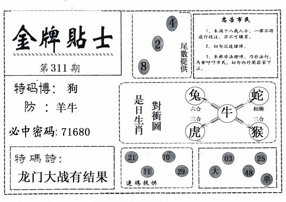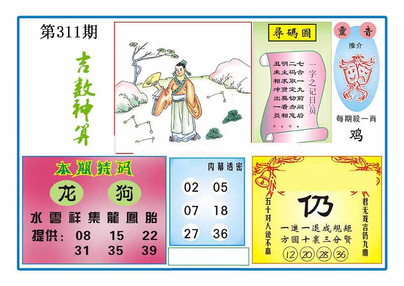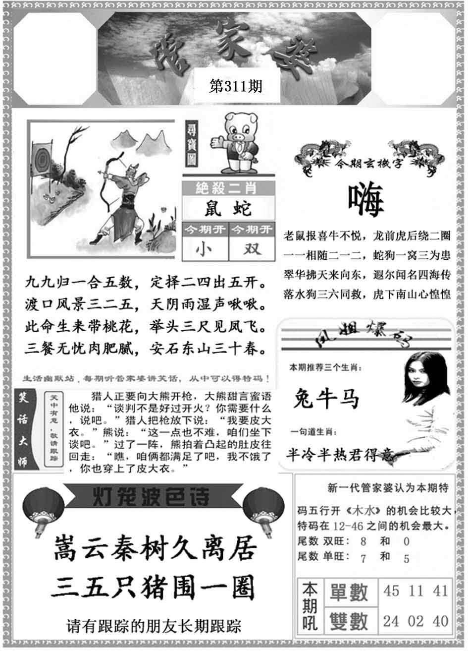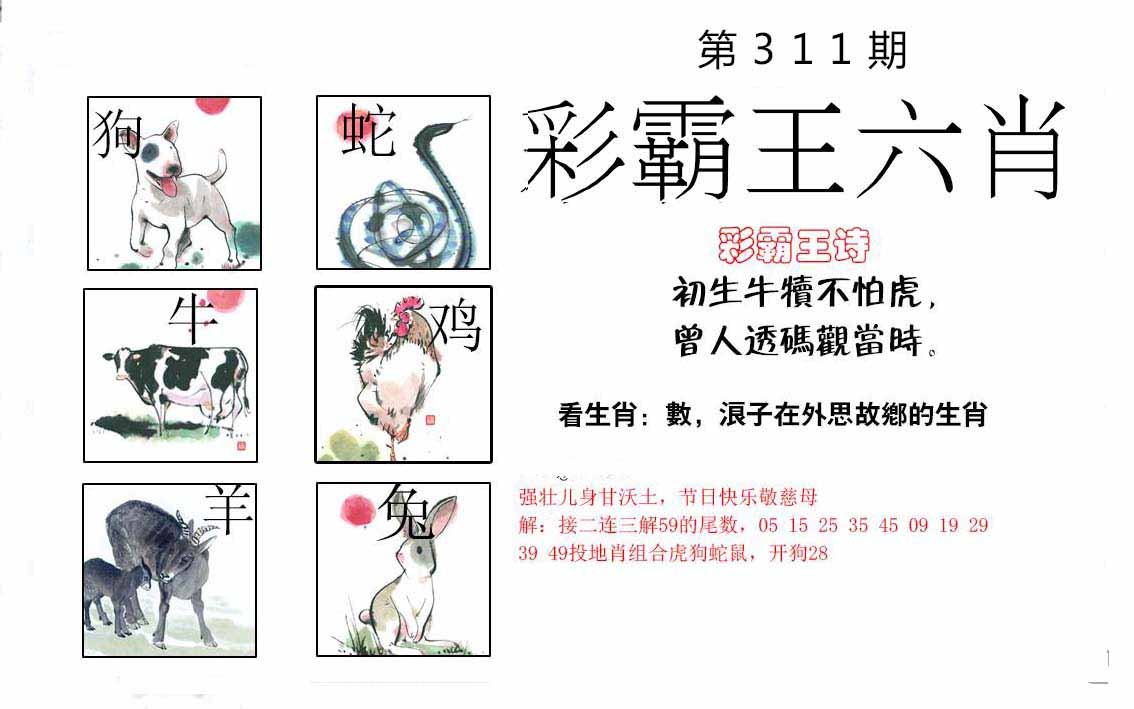 311期:【另版跑狗】开0 跑狗九肖:猪龙虎鸡兔马狗牛羊 跑狗七肖:猪龙虎鸡兔马狗 跑狗五肖:猪龙虎鸡兔 跑狗三肖:猪龙虎 12码:36 46 25 40 44 27 16 45 37 21 32 26 | ||
