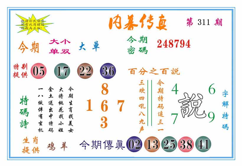 | 300期:精准五不中【41 26 25 32 45】猴10 |