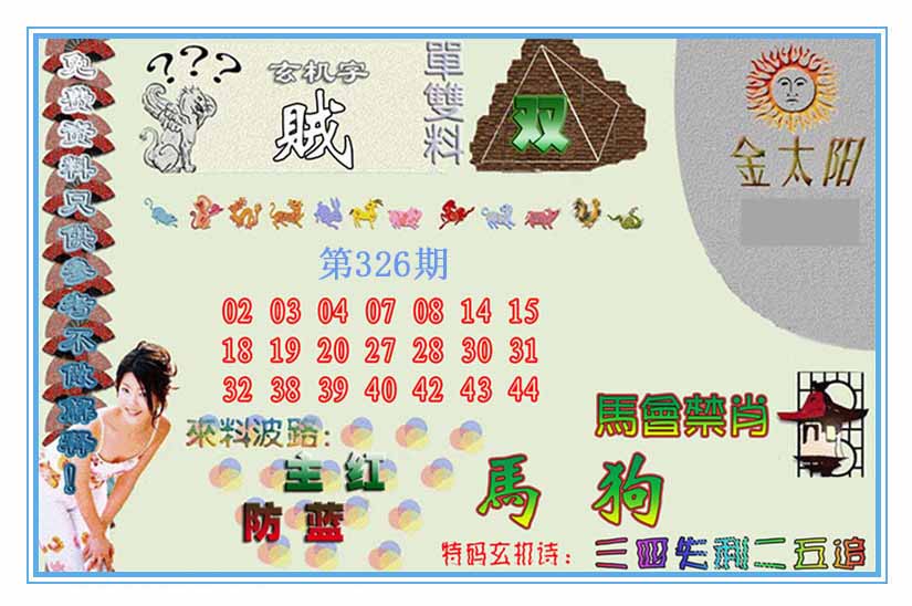 323期:【另版跑狗】开龙14 跑狗九肖:羊鼠鸡兔虎蛇狗马猴 跑狗七肖:羊鼠鸡兔虎蛇狗 跑狗五肖:羊鼠鸡兔虎 跑狗三肖:羊鼠鸡 12码:38 31 19 44 11 04 33 27 05 23 14 37 | ||