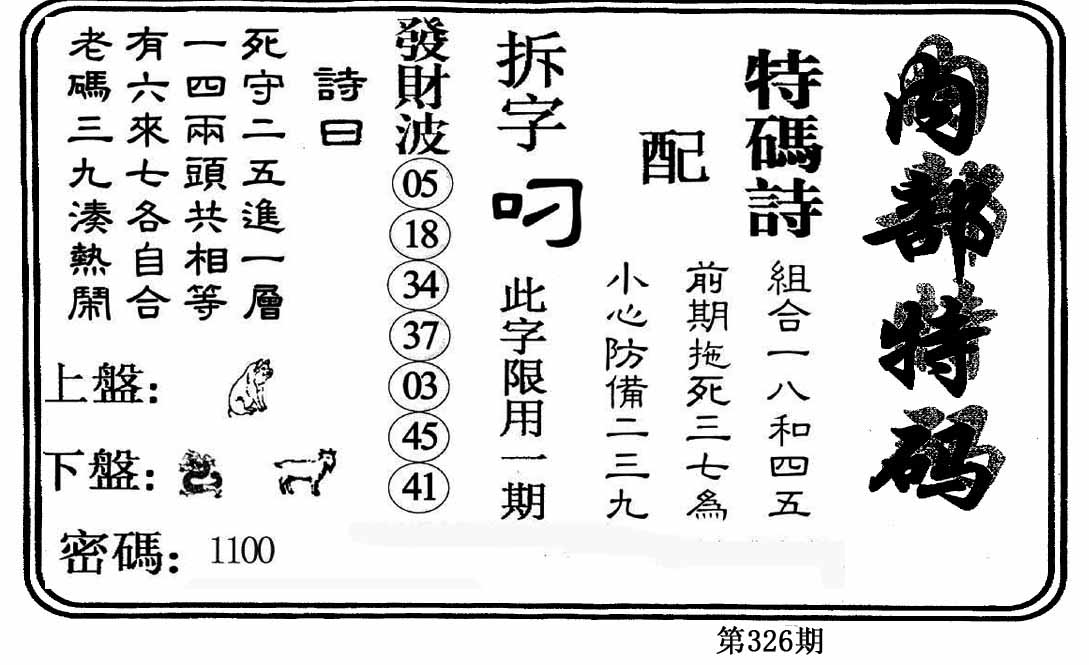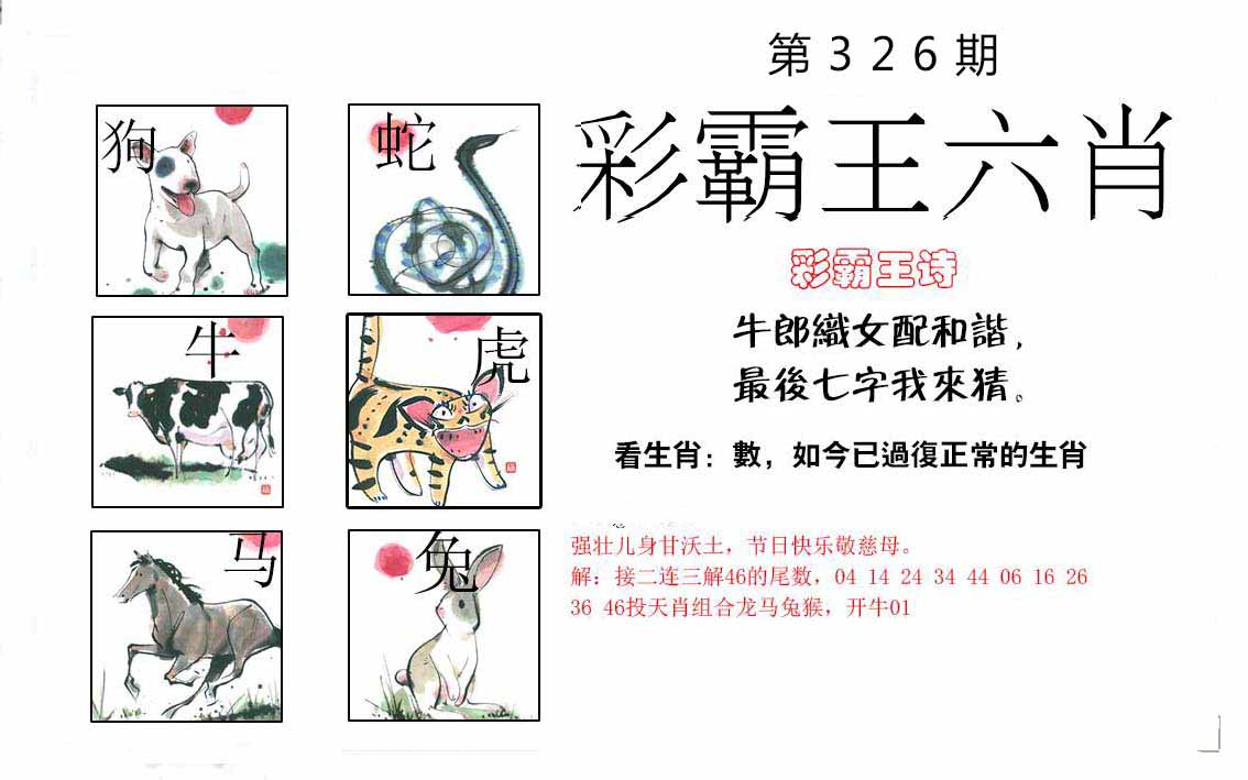 326期:【另版跑狗】开0 跑狗九肖:兔牛虎龙马鼠狗蛇鸡 跑狗七肖:兔牛虎龙马鼠狗 跑狗五肖:兔牛虎龙马 跑狗三肖:兔牛虎 12码:01 34 48 30 11 09 13 36 15 21 43 35 | ||